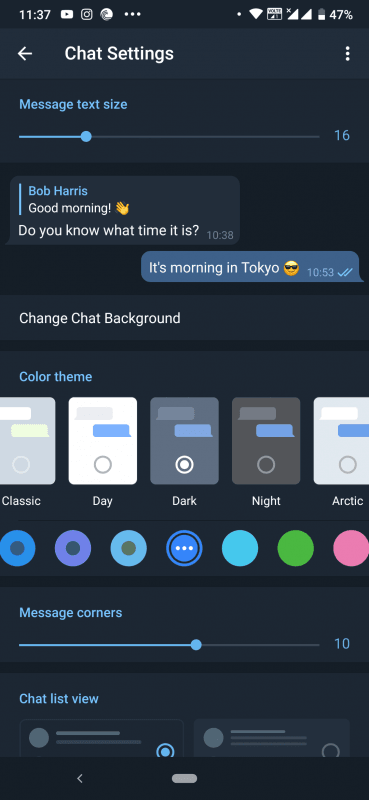 When it comes to customisation, the regular Telegram comes with ready-made themes that you just have to choose on top of the light or dark mode. On the other hand, Telegram X offers a lot more options for personal themes with the option of choosing colours from scratch.