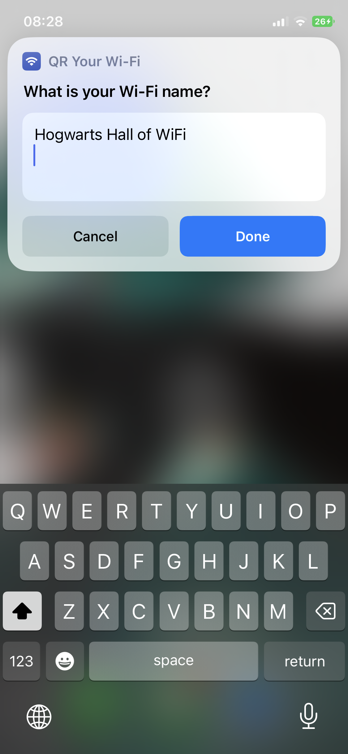 - Tap on the widget to run the command. Enter your Wi-Fi name and password prompted by the shortcut. A QR code is then generated.